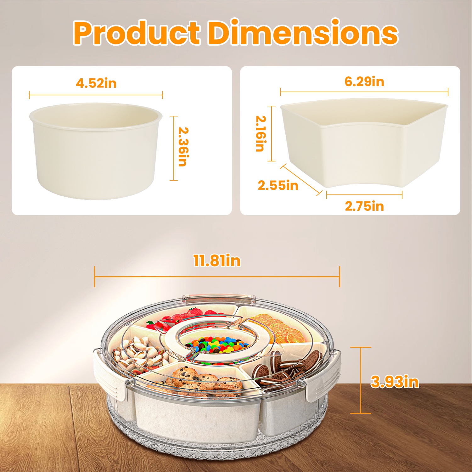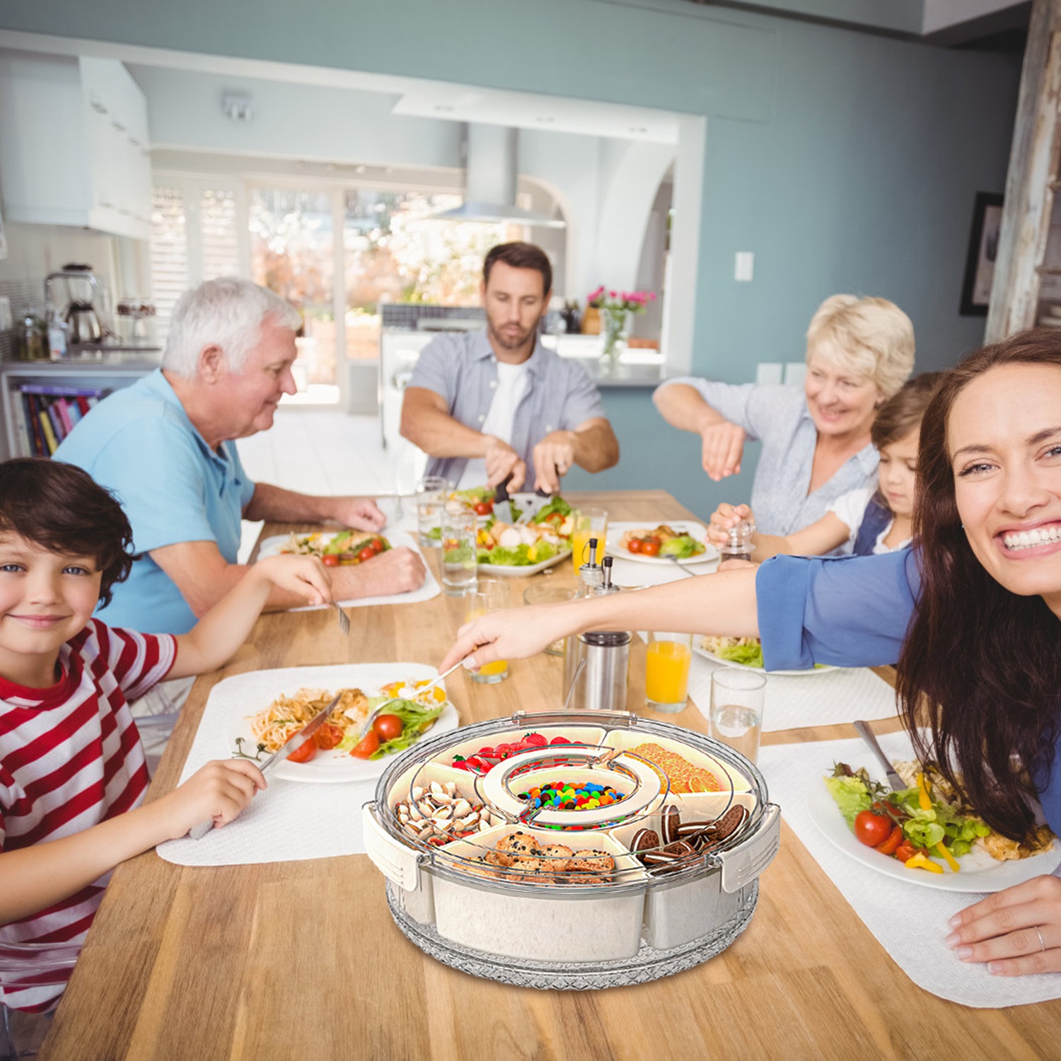 Perfect for storing snacks, fruits, nuts, candies, and even salads, our divided serving tray is designed to keep your snacks and fruits neatly sorted while preventing any unwanted mixing of flavors. Sealed lid with silicone circle and secure latches helps maintain freshness and cleanliness of food. And hidden handle ensures convenient portability wherever you go. 360° rotatable base makes serving yourself and your guests much easier than ever before. Whether you\'re camping, hosting a party, enjoying a picnic, or having a family movie night, our divided snack box containers is your best choice!