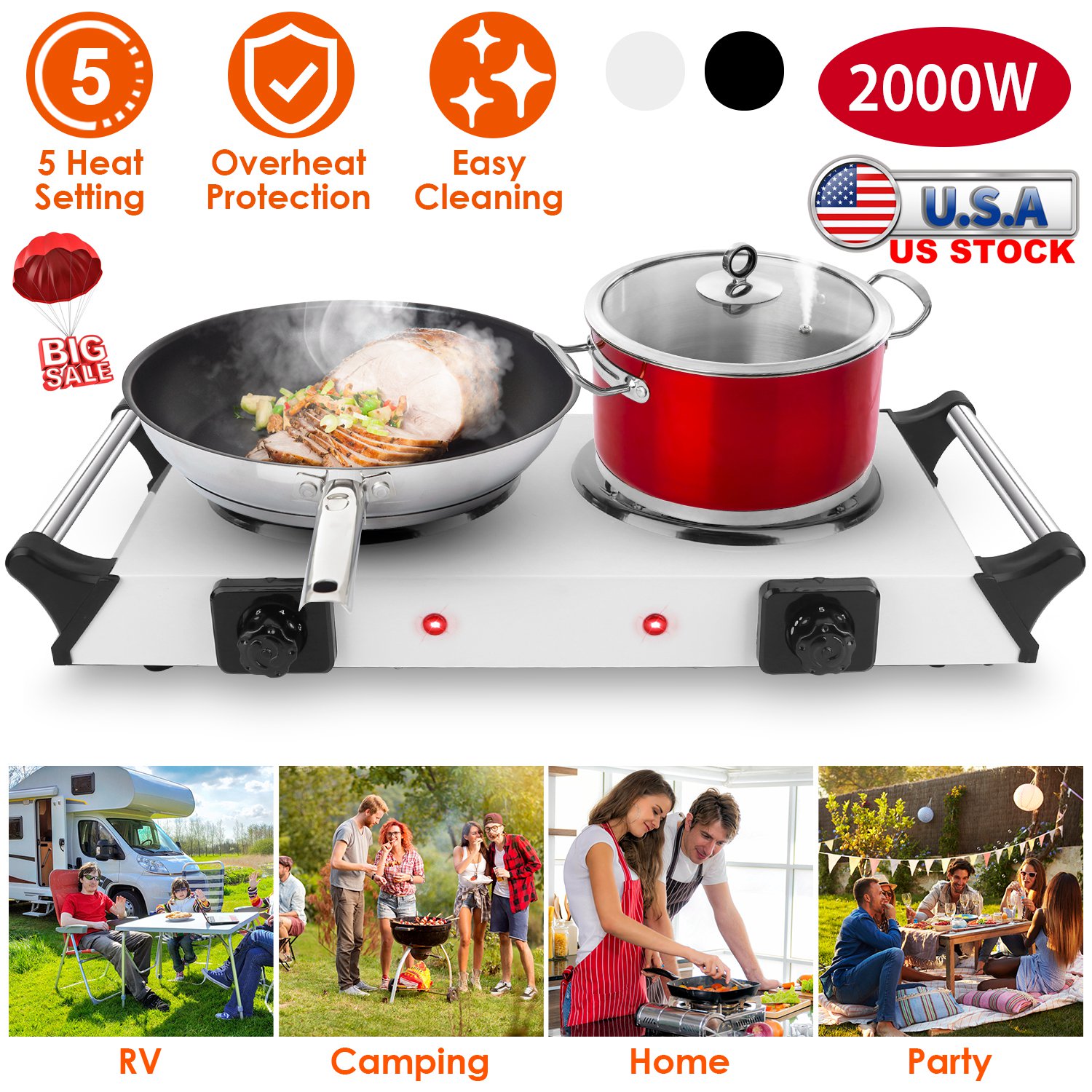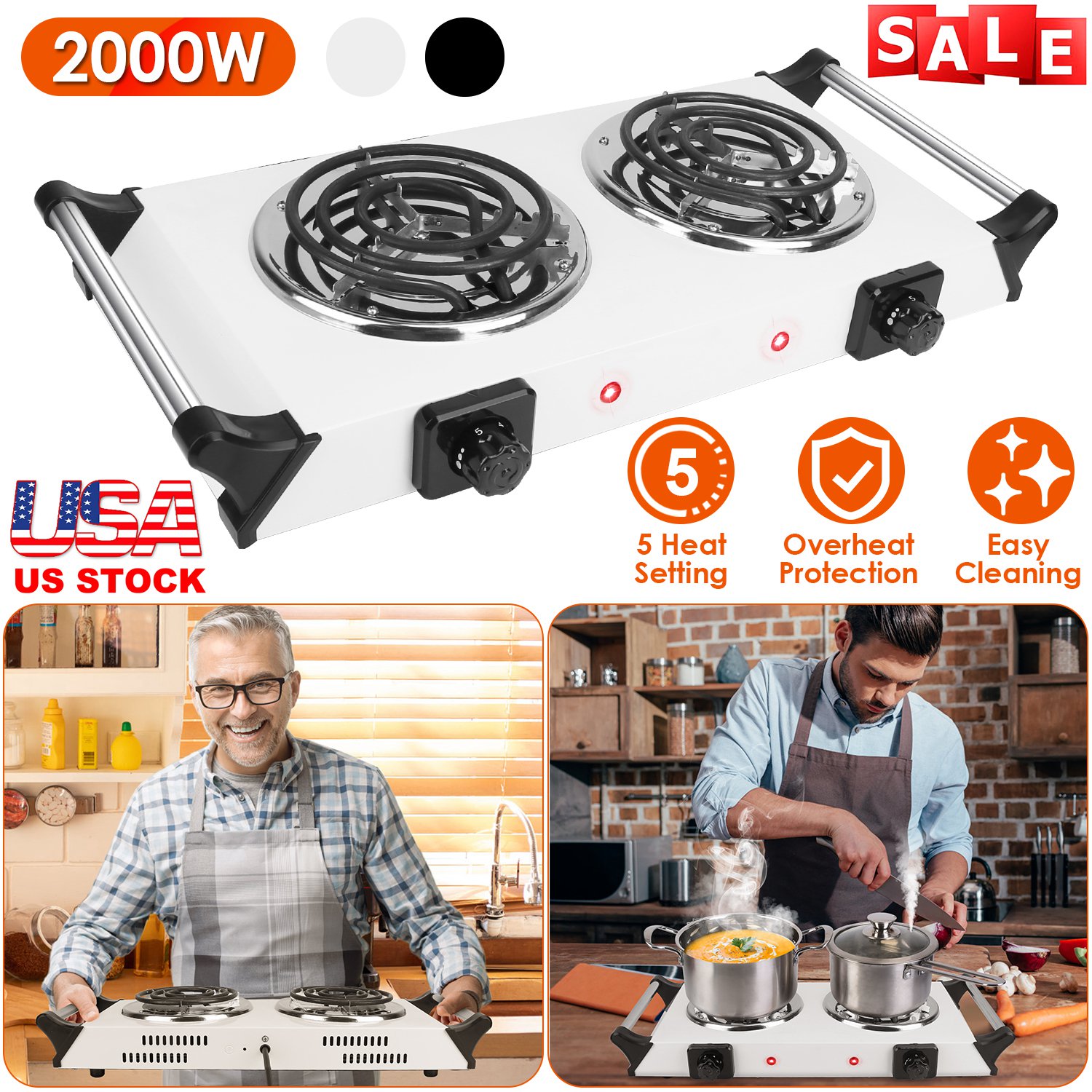 Home > 2000W Electric Dual Burner Portable Coil Heating Hot Plate Stove Countertop RV Hotplate with 5 Temperature Adjustments Portable Handles